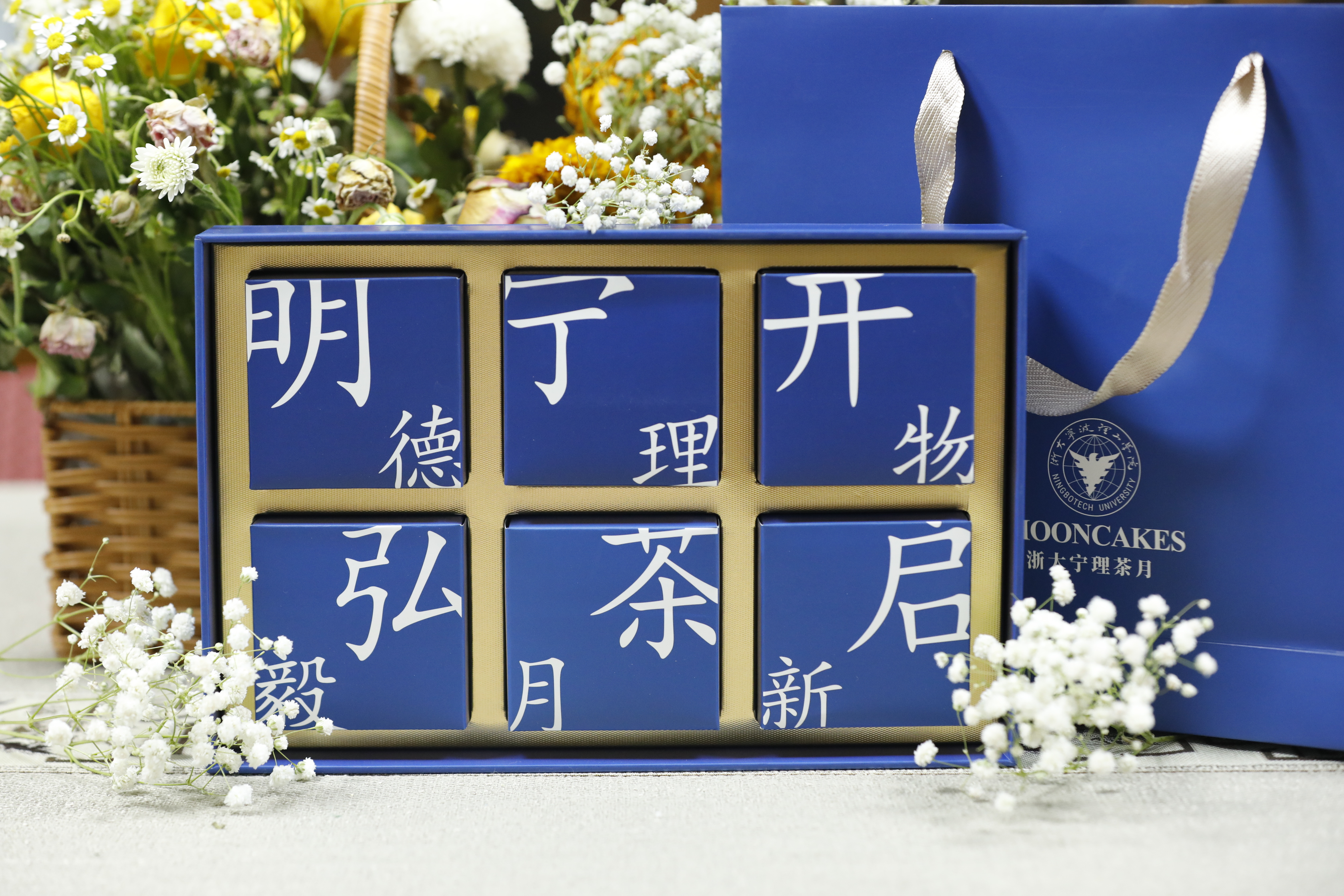 在包装上,“浙大宁理茶月礼盒”以经典的理工蓝为主色调,内盒金色镶边在简约中增添了几分高贵与典雅,画面以简洁的线条和几何形状,勾勒出浙大宁理标志性建筑的剪影,满满的书卷气伴着浓浓的国风扑面而来。“明德弘毅,开物启新”,印有浙大宁理校训的内包装盒凝聚着,每个浙大宁理人的精神内核。