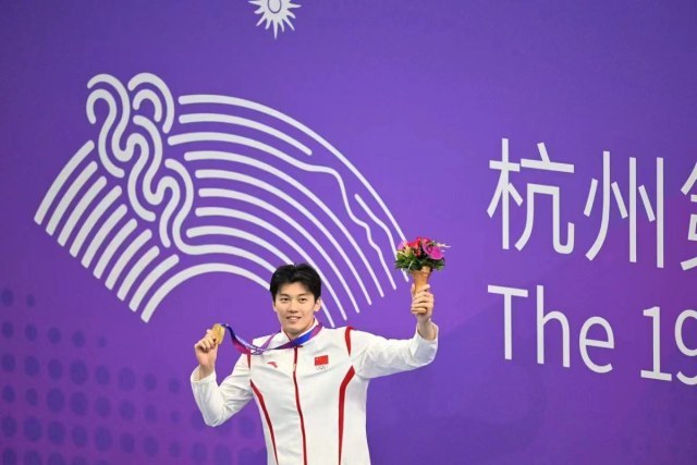 ▲ 宁波游泳名将汪顺在杭州亚运会首日比赛中获得200米混合泳金牌,并创造新的亚洲记录。