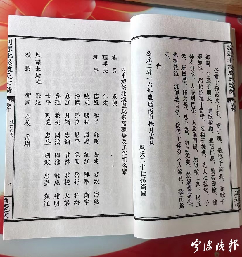 王军伟教授长期关注宁波乡村文化基因,他也是宁波市文化基因社科普及基地的负责人,不少乡村留下他和学生的足迹。“地方的文化基因要从史书、方志,以及地方现存的文化遗存中寻得。”王老师带队进村第一天,便寻起了北溪村志和家谱。