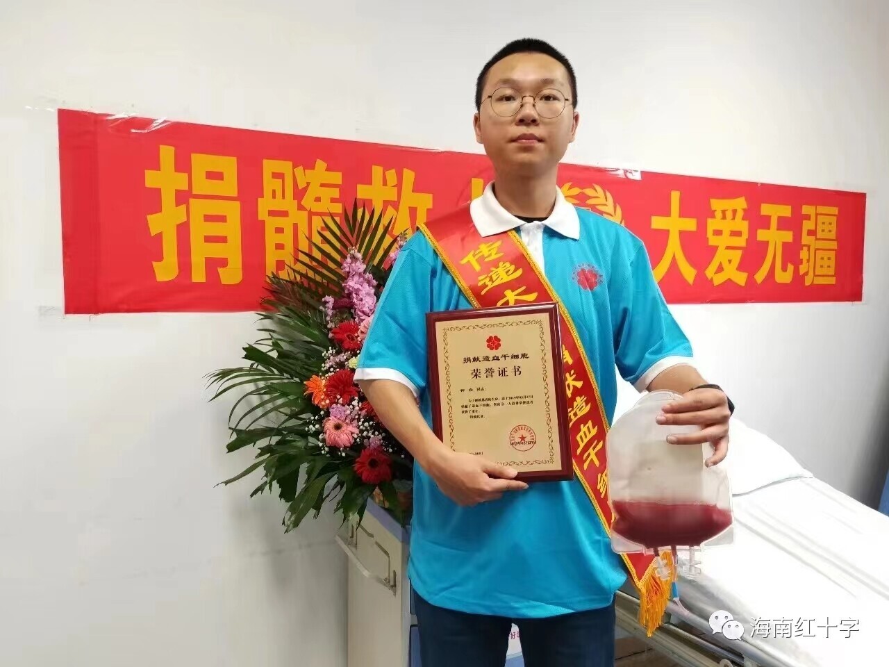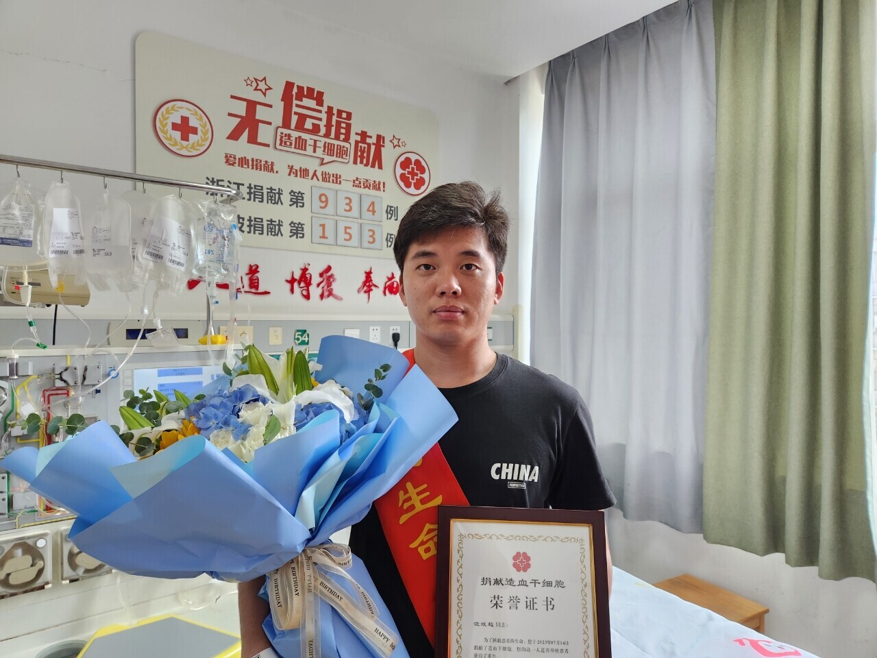 7月10日,刚刚考完期末考试的沈斌超就马不停蹄地在红会工作人员的陪同下,入住第一医院,开始注射动员剂,提高外周血的干细胞数量。14日11时35分,沈斌超顺利完成造血干细胞捐献,成为是浙江省第934例、宁波市第153例、鄞州区第33例造血干细胞捐献者。