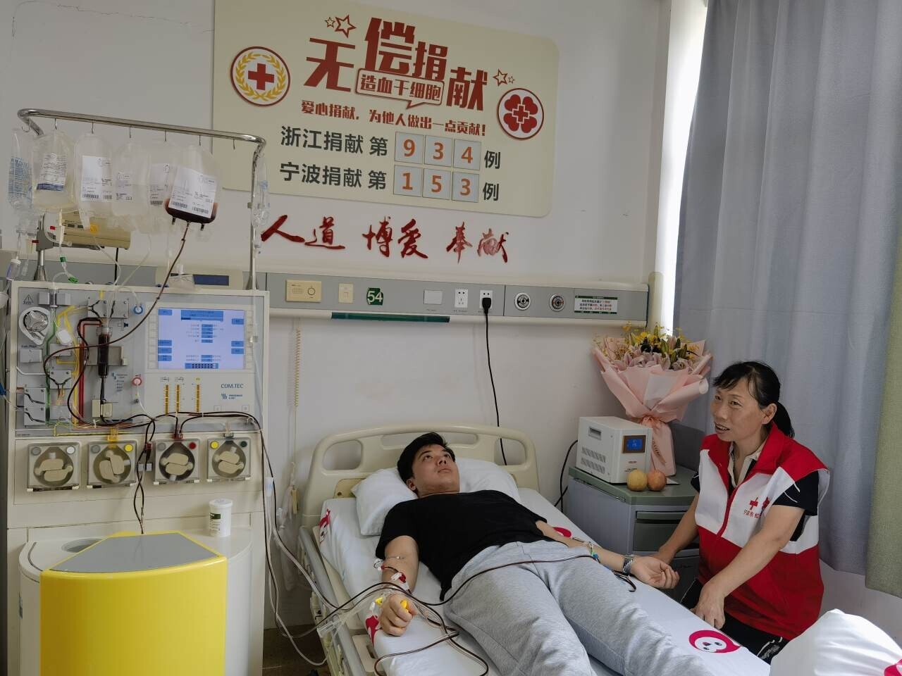 当天上午8时50分,沈斌超经过2小时45分钟的采集,伴随着仪器正常运转的“嗡嗡”声,210毫升造血干细胞混悬液聚集到采集袋中。鄞州红会工作人员说:“这也是我们鄞州区红会办理的首例在校大学生捐献造血干细胞。”