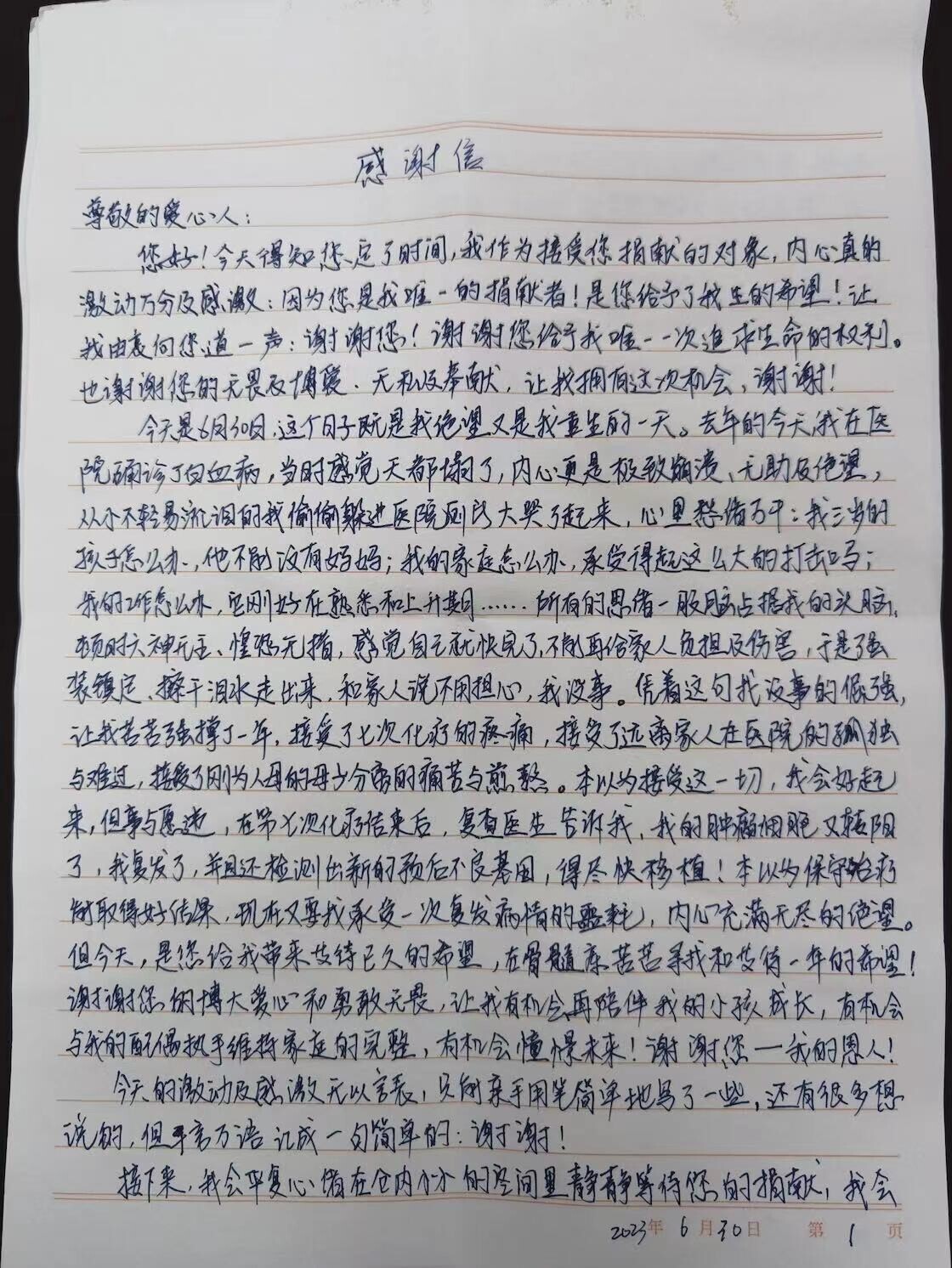 “我知道受捐者是一名母亲,这也让我想起自己母亲。”沈斌超说,“我还收到了受捐者的一封感谢信,知道了她患病的整个过程。希望,未来她能好起来,好好生活下去。”
