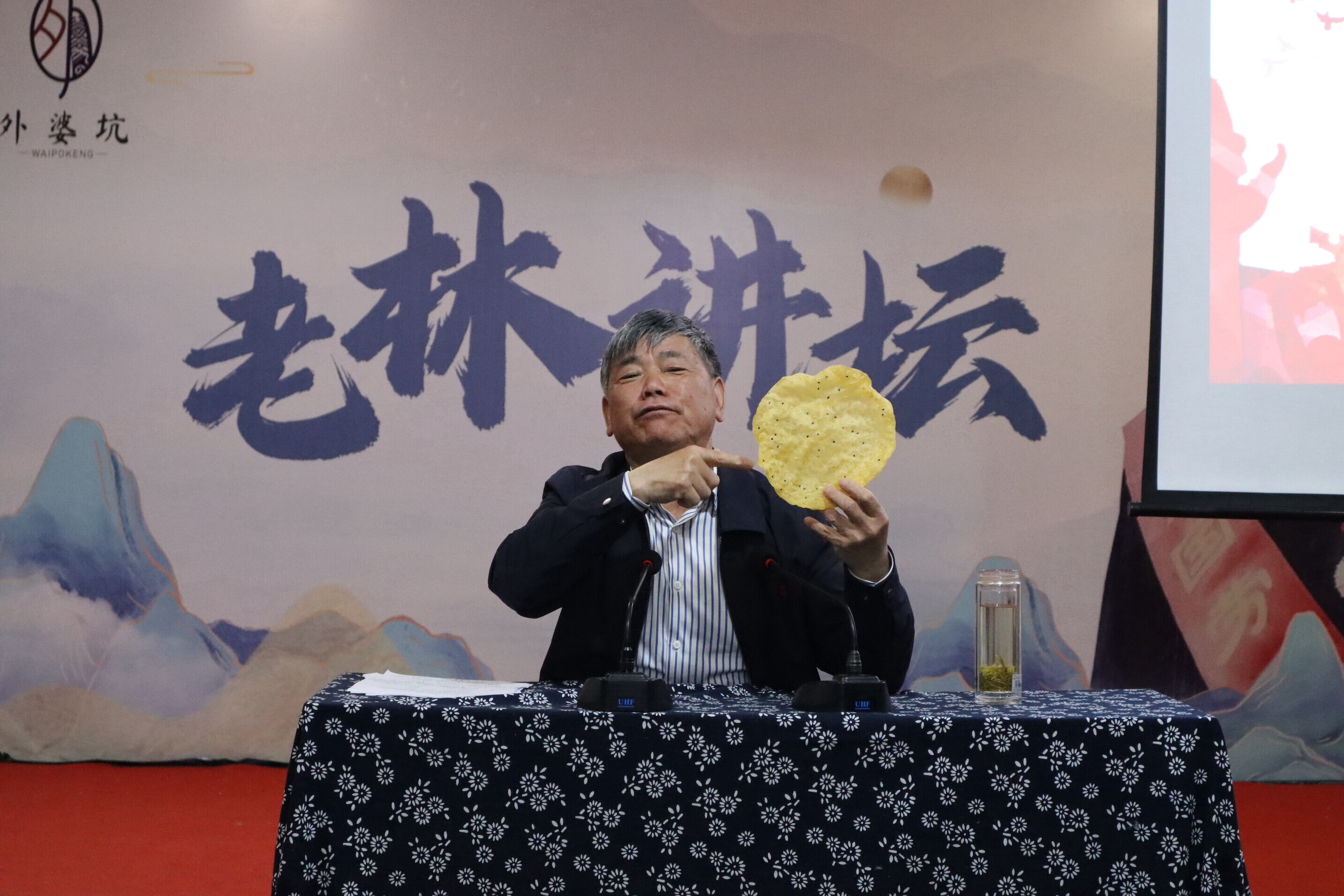 图为全国劳动模范、“中国好人”、外婆坑村党支部书记林金仁以“一张玉米饼的故事”为主题为设计学院师生上党课。中国青年网通讯员 沈浩东 供图