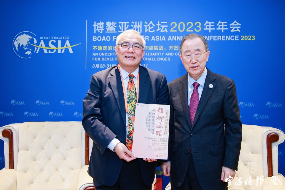 今年3月底,周斌教授应邀出席博鳌亚洲论坛2023年年会,潘基文担任博鳌亚洲论坛理事长。周斌除了是上海交通大学——南加州大学文化创意产业学院中国书法教育学教授外,他还是潘基文的书法老师,潘基文跟随周斌老师学习书法的过程中,学到很多中国传统文化内容。他常书写的“曲则全”“上善若水”“天地和同”“厚德载物”等,就出自中国道家和儒家的典籍。再比如他对老子哲学和道家智慧非常崇尚,这甚至影响到潘基文的行政理念。