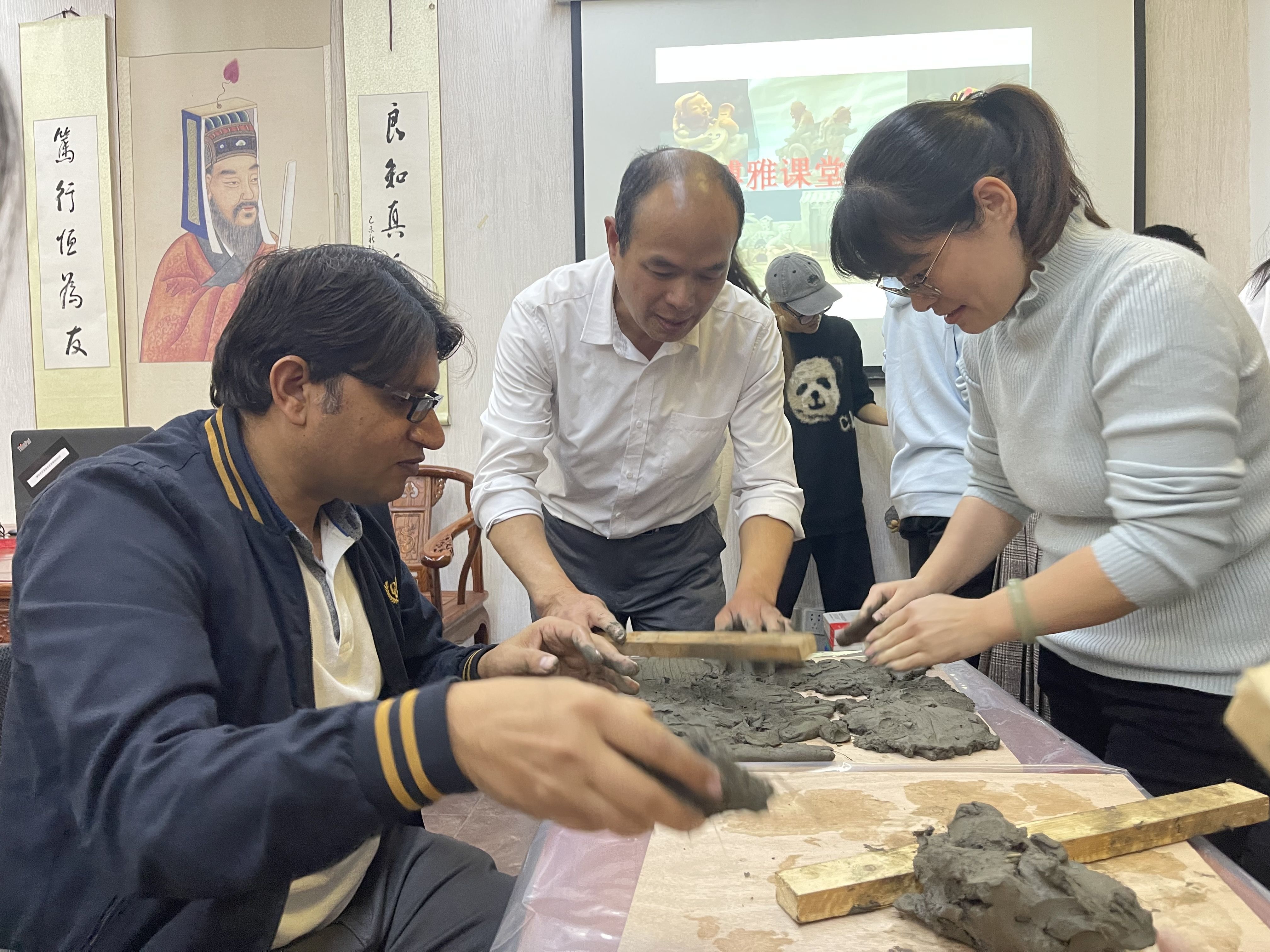 近日,开云kaiyun官网阳明学堂里总能听到一阵阵“噼里啪啦”的敲击拍打声。原来,学堂里三四十位同学正在上一堂新奇有趣的“博雅课堂”泥塑专班课。