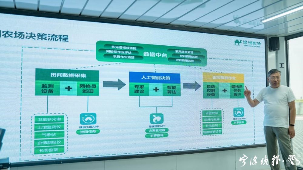 在看似平静的棉田里,“黑科技”从土壤“武装”到了天上。土壤检测仪,检测土壤墒情;智能气象站,可以做出灾害天气预警;虫情测报仪,通过比对识别害虫发出预警并提醒防虫作业……此外还有长势监测、智能喷洒设备、水肥一体机等,这些数据汇总到智慧棉田系统,可以调度视频监控,还能对网格员作业、农机作业、灌溉质量等进行监管评估。手机终端还有绿洲管家和绿洲小哥APP,点点屏幕就能进行农事任务派发和相关农事指导。