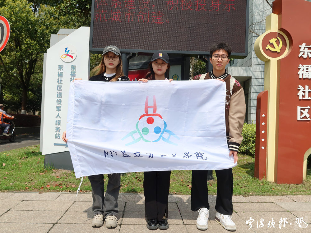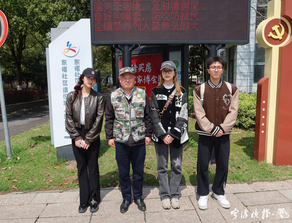 大学生和东钱湖镇东福社区主任薛明(左二)合影。