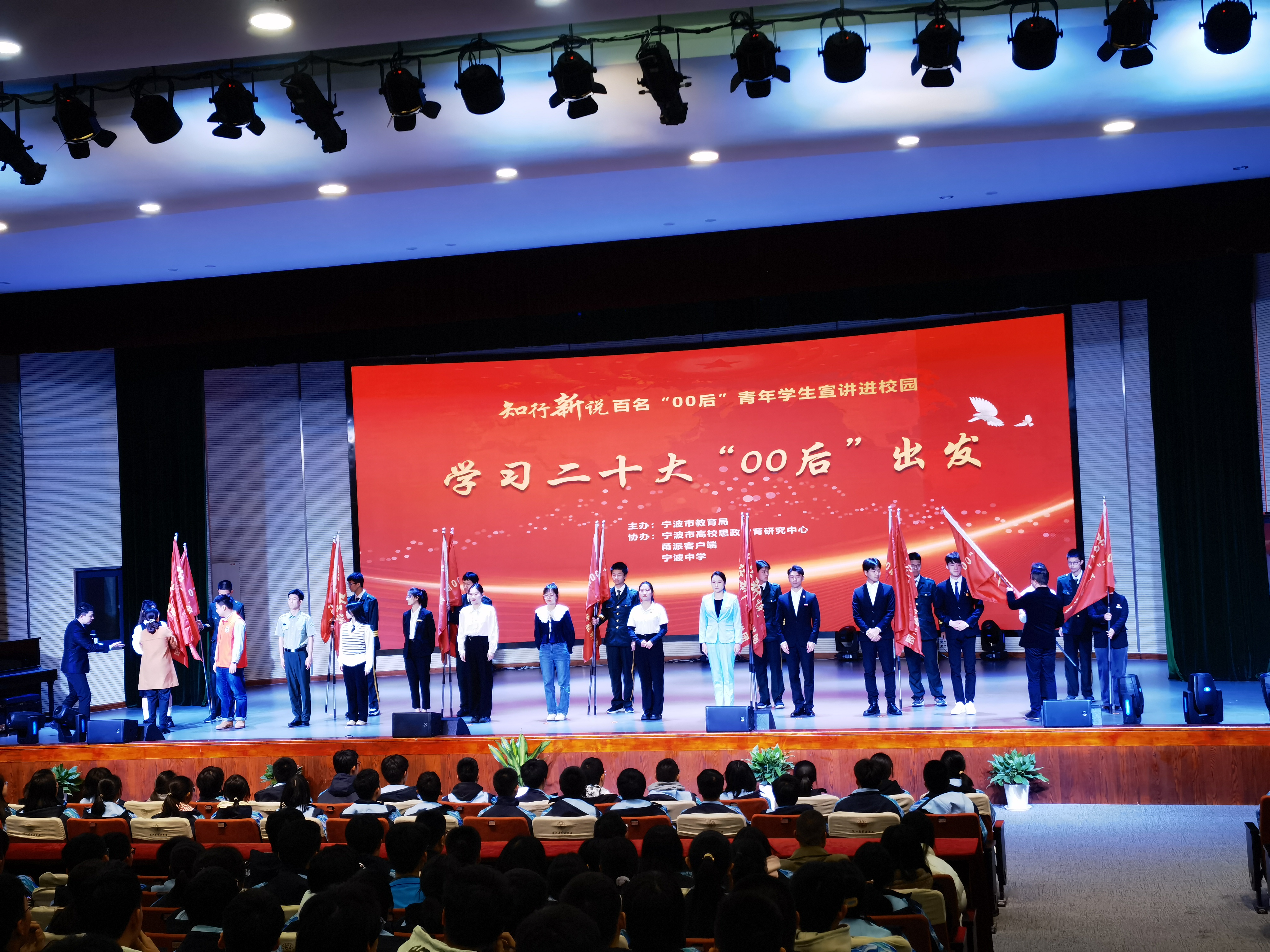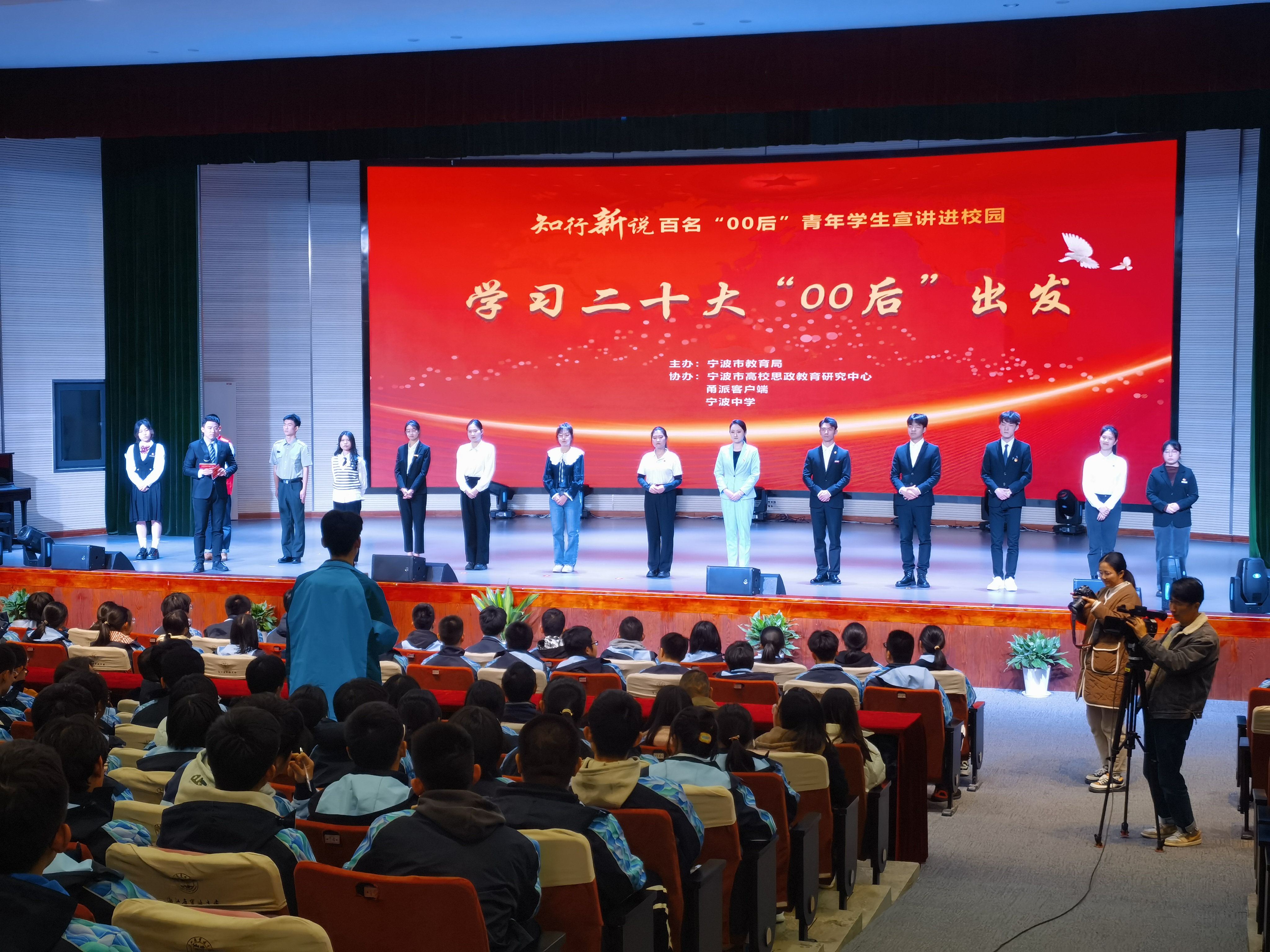 当天和张浩东一起走进宁波中学的,还有来自宁波大学、宁波工程学院、宁波城市职业技术学院等14所宁波高校宣讲团的大学生,他们来到中学生中间,从朋辈视角讲述自己学习成长的真实经历和对时代的感悟。这是宁波市教育局创新思政教育模式,推出的“知行新说”系列活动——百名“00后”青年学生宣讲进校园的首场活动。