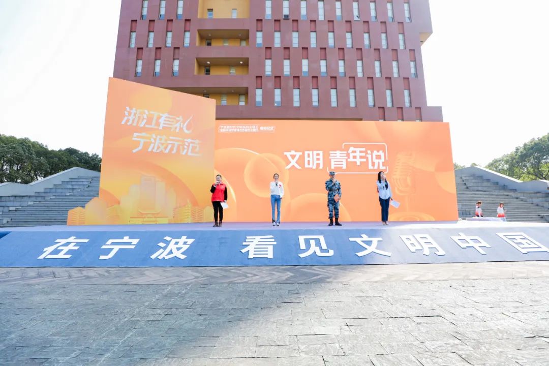 在活动现场,一段主题为“文明,向阳而生”的鲜花快闪活动视频,让现场观众感受到了温暖和文明的风尚。鄞铃文艺宣讲团带来了党的二十大精神宣讲《领航新时代》;李靖慧、孙嘉怿等四位青年代表在《文明青年说》中讲述了自己与文明的故事;汪顺、杨倩、米娜与青年学生们一起,发出新时代文明实践主题日青年倡议;明州喜剧带来志愿服务脱口秀,用青年眼、身边事,讲述新时代文明实践故事,幽默诙谐的“包袱”频出,引得观众频频鼓掌;鄞州区新时代文明实践高校联盟还发布十大青春行动,并与相关街道(乡镇)结对开展校地合作。由50名青年志愿者组成的小遛骑行队伍,带着文明旗帜,走出校园,进入商圈,驶入大街小巷,用自身行动传播文明新风尚。