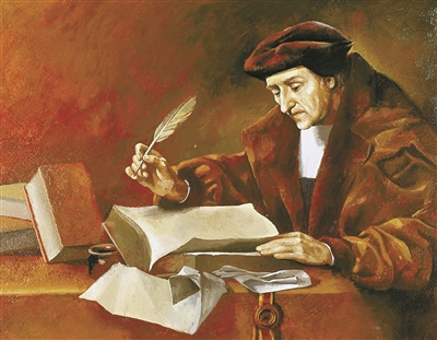 与此同时,欧洲正处于中世纪末尾,文艺复兴运动方兴未艾,基督教神学世界观仍占据统治地位。伊拉斯谟遍历欧洲多国,任职大学反对经院主义,逐渐成为欧洲文化的集大成者。他勇敢揭露天主教廷的腐朽本质,倡导溯源经典回归本源,主张以道德理性建构理想社会。他的思想启迪了欧洲社会一大批革新人士,包括德国宗教改革领袖马丁·路德,当时的人们甚至用“伊拉斯谟下蛋,马丁·路德孵鸡”的比喻来描述伊拉斯谟思想的深刻性。西班牙作家塞万提斯也深受伊拉斯谟的影响,他的小说充满对现实主义的批判,他借堂吉诃德之口说出:“血统是从祖先继承,美德却是自己养成;美德自身就有价值,血统却没有。”此外,伊拉斯谟与挚友《乌托邦》的作者托马斯·莫尔,以及教育家维夫斯等人,共同推动了十五世纪、十六世纪西欧社会转型时期追求真理、德行和智慧的人文主义思潮。