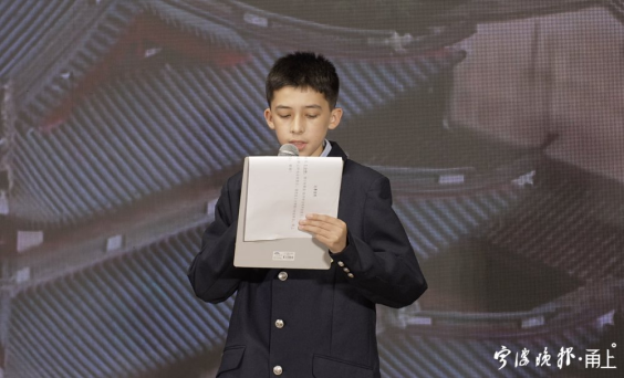 “梁祝化蝶演绎着千古绝唱,范蠡与西施荡舟在钱湖之上......宁波宁波,众人划桨,乘风破浪!”来自新西兰的选手Maxwell Marcus现场诗朗诵了一段由宁波诗词及民间文艺创作人湿人甲创作的《宁波远航》,赢得了现场阵阵掌声。