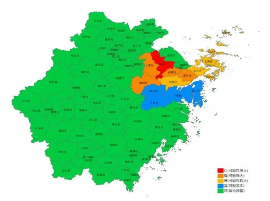 9月4日18时至9月5日18时,宁波市(海曙区、江北区、北仑区、镇海区、鄞州区、奉化区、余姚市、慈溪市)、绍兴市(上虞区)等部分地区地质灾害气象风险很高(红色预警);宁波市(象山县、宁海县)、绍兴市(越城区、柯桥区、新昌县、嵊州市)、舟山市(定海区、岱山县)、台州市(三门县、天台县)等部分地区地质灾害气象风险高(橙色预警);湖州市(安吉县)、绍兴市(诸暨市)、金华市(磐安县、东阳市)、舟山市(普陀区、嵊泗县)、台州市(仙居县、临海市)等部分地区地质灾害气象风险较高(黄色预警)。