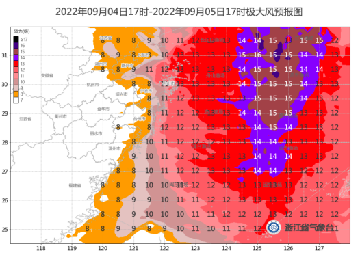 今天傍晚到明天(4-5日)东海海域风力13~16级,台风中心经过附近海域阵风可达17级或以上;浙江沿海海面有10~12级阵风,其中浙中北沿海海面部分13~15级;浙北沿海地区和杭州湾水面风力8~10级局部10~12级,浙中南沿海地区阵风8~9级;浙中北内陆部分地区阵风也有7~9级。
