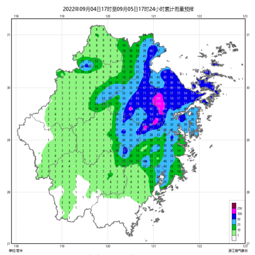 预计4日20时至5日20时,余姚市发生山洪灾害可能性极大(红色预警),海曙区、鄞州区、上虞区、嵊州市发生山洪灾害可能性大(橙色预警),北仑区、奉化区、定海区、普陀区、岱山县、嵊泗县发生山洪灾害可能性较大(黄色预警),象山县、宁海县、新昌县、天台县可能发生山洪灾害(蓝色预警)。请密切关注天气形势及雨水情变化,注意防范强降水引发的山洪灾害。