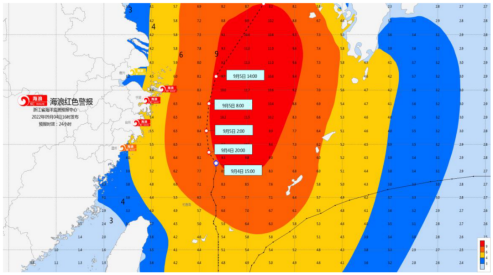 近海海域:杭州湾有3.0米到4.0米的大到巨浪;浙江北部、中部有8.0米到10.0米的狂浪到狂涛;浙江南部有8.0米到10.0米的狂浪到狂涛,明天傍晚减小到4.0米到6.0米的巨到狂浪。台风中心经过的海面将出现12米以上狂涛。近海海域海浪预警级别为橙色。