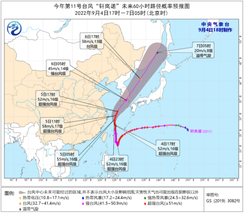 今日19时,今年第11号台风“轩岚诺”(超强台风级)中心位于北纬27.5度、东经124.5度,距离浙江省朱家尖岛东南方向约340公里,预计将以每小时15公里左右的速度向偏北方向移动,强度维持或略有增强。5日上午起在浙江东北部近海(东经124度附近)转向东北方向移动。