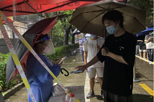 夜深了,风雨交加。因为做核酸的一楼大厅容纳不下太多人,不少学生打着伞,排到了室外。为此,学校开放沿途教室用作学生候场,学校食堂也加班加点为冒雨做核酸的同学和志愿者们送来了姜汤。