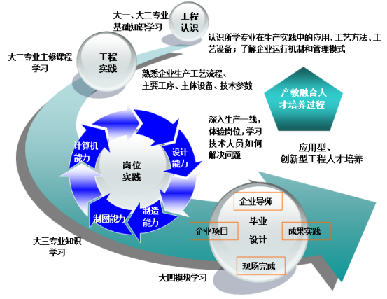 学生进入产业学院产教融合培养体系后,将被指导开展二年职业规划,使其了解自己、了解专业、了解产业,增进专业认同和行业归属。从第三学年开始,学生进行产业相关基础知识的学习,促进专业知识体系向产业知识体系的衔接转化;学生在第四学年进入产业学院共建企业,以具体项目为载体,在企业导师和学校导师的共同指导下,参与开展企业实际工程项目,应用自己所学的专业知识,理论联系实际,解决复杂工程技术问题,实现每个学生对企业所涉产业环节全过程参与、全过程检验、全过程基本掌握。坚持因材施教原则,发挥各有所专的优势,实施项目建设驱动,实现人才高质量培养。