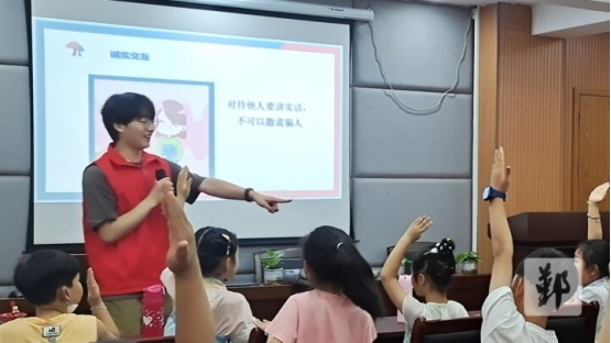 “小朋友们你们知道鱼为什么会游泳吗?为什么鱼可以一直待在水里,而我们人类却不可以呢?……”经过简短的开班仪式后,志愿者老师根据未成年人的年龄和理解能力,采取通俗易懂的绘本及儿歌的形式,生动活泼地向小朋友们讲解了防溺水、安全用电、文明交通等基本安全常识。小朋友们听得津津有味,同时和老师积极互动。