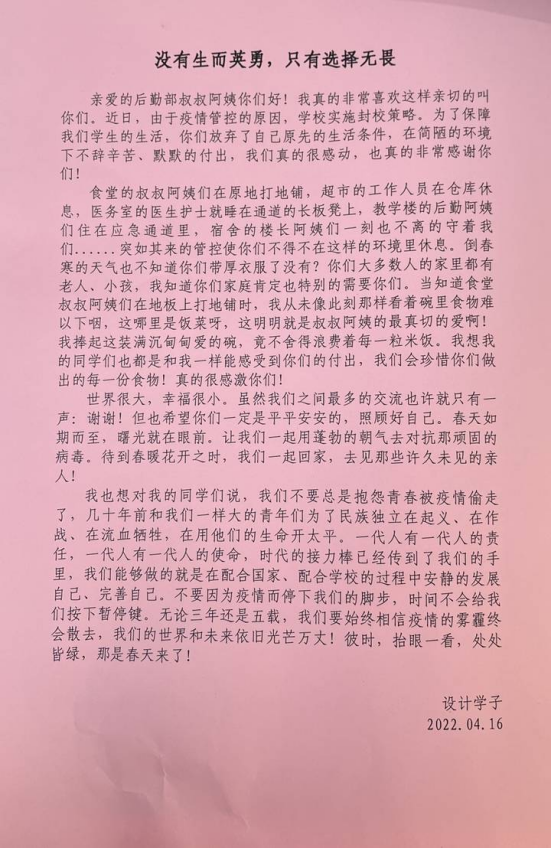 “亲爱的后勤部叔叔阿姨你们好!我真的非常喜欢这样亲切的叫你们。近日,由于疫情管控的原因,学校实施封校策略。为了保障我们学生的生活,你们放弃了自己原先的生活条件,在简陋的环境下不辞辛苦、默默的付出,我们真的很感动,也真的非常感谢你们!