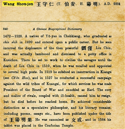 翟理斯著《古今姓氏族谱》论述的王阳明片段