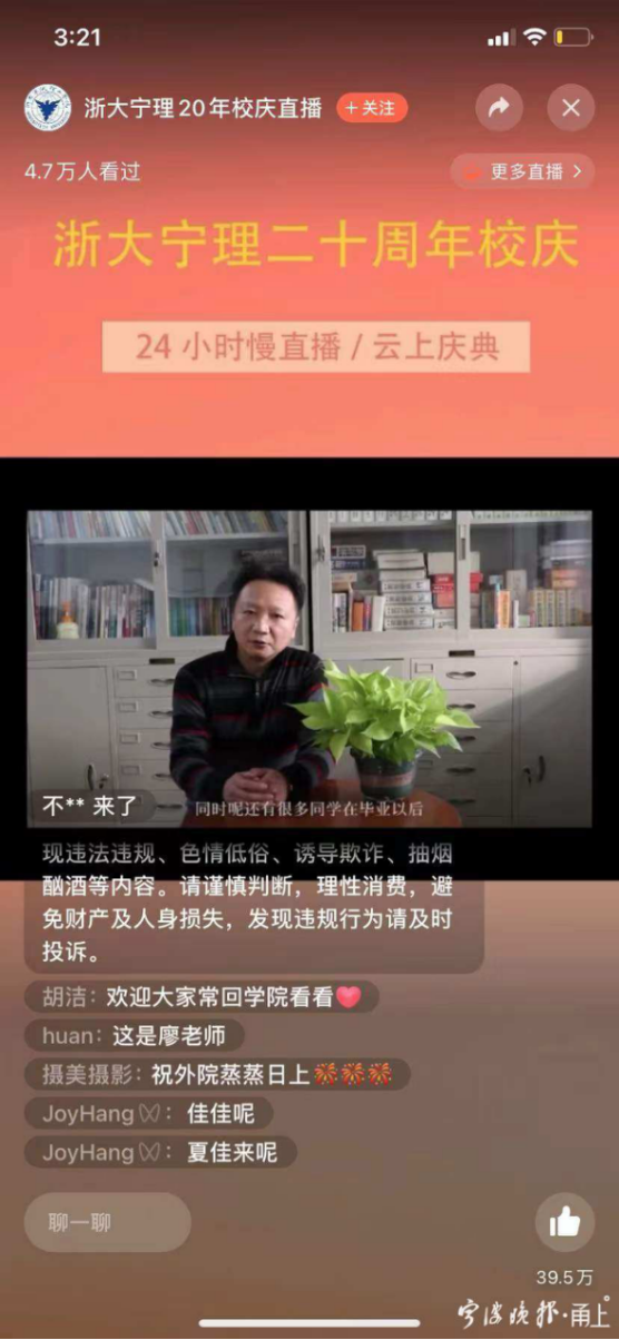 今天下午是浙大宁理10个二级学院的云端展播时间,各学院在一小时里带领广大校友重回课堂,重拾青春,感受学院发展。截止下午三时,校庆直播吸引近5万人观看,点赞超38万人次。