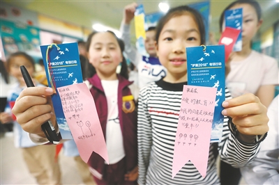 昨天,白鹤街道黄鹂社区联合浙江大学宁波理工学院的大学生志愿者,走进黄鹂小学“四点钟学校”宣传“扫黄打非·护苗2018”暨“绿书签”活动。图为孩子们展示寓意为“绿色文化环境”的“绿书签”。