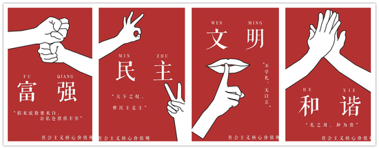 近日,浙江大学宁波理工学院传媒与设计学院学生设计党支部在学校集中开展学习党的十九大精神主题党日活动期间,将精神学习与专业学习有机结合起来,将课堂教学与思政教育融合起来,推出图说社会主义核心价值观系列作品,其中一组“手话”作品吸引师生目光,叫人点赞。