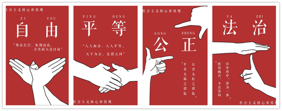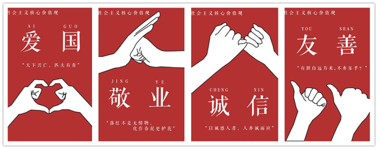 关于此次作品的创作灵感,郑同学表示:“正是源于学校老师将党的十九大精神融入课堂教学,耳濡目染让我对此有了更深刻的理解。前阵子我在准备党课考试时突然想到怎样才能让大家更容易记住社会主义核心价值观,便创作了这样一组“手话”作品。”