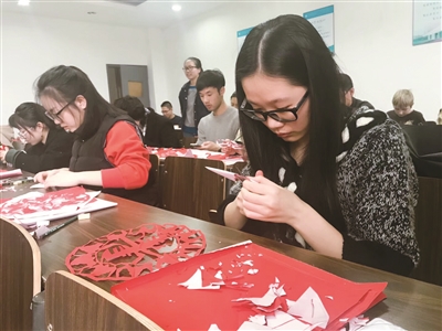 浙江大学宁波理工学院“博雅课堂”剪纸专班日前开课,师生们围绕“吉祥”这一主题,学习剪纸艺术。剪纸专班面向社会免费开放,还纳入了宁波市“一人一艺”全民艺术普及工程。图为学生在学习团花“五福捧寿”的剪法技巧。(本报通讯员 刘淑芬 摄)