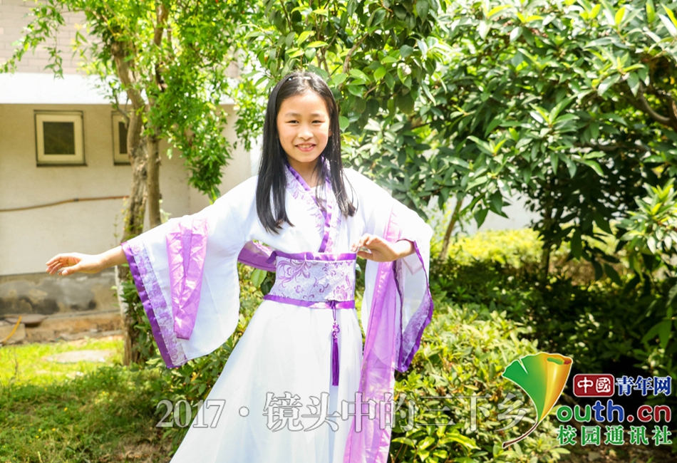 在换上齐胸襦裙后,孩子们纷纷化身为小公主,小骑士。其中一位有着舞蹈功底的孩子,在平地上翩翩起舞,舞动青春。中国青年网通讯员 于佳铭 摄