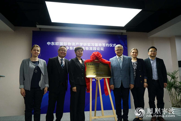 图为双方领导为中东欧国际物流产学研基地揭牌