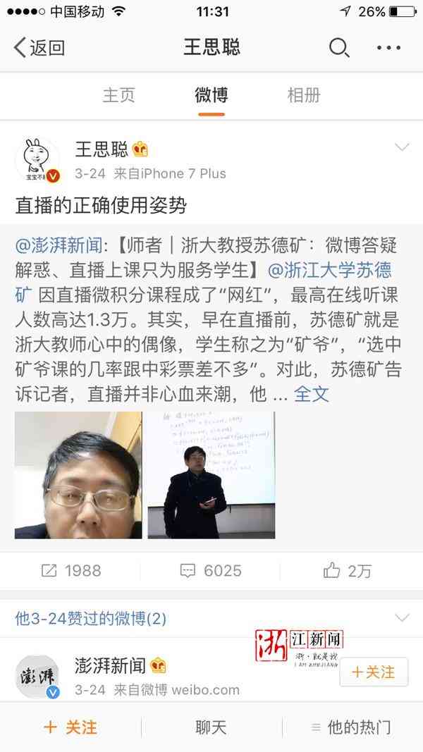 “谢谢王老师,直播在教育上的应用前景有着极大的空间,将会引起教育教学的巨大变革。欢迎王老师到浙大来和我们师生交流。”苏德矿在微博上对王思聪如此回应。