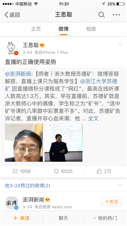——浙大教授微博答疑解惑、直播上课只为学生