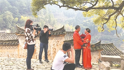 图为黄昊楠的团队成员在为一对老夫妻补拍婚照。
