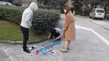 几只画笔,几盆颜料大家用双手勾勒形状,为冬季校园上装,给水泥地增添了一份生动妖风刺骨,腿蹲得再酸,也依然保持微笑为校园文化建设默默贡献一份力量。