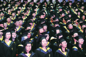 仪式很简单,首先大屏幕播放学生在学校的生活片段。然后是校领导上台,大家分工明确,有的负责给学生颁发学位证书,有的给学生拨流苏,院长负责合影。拍合影照的摄影师说今年毕业生人数近三千人,会场坐不下,所以仪式分四场举行。