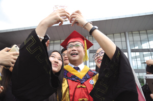 中午吃饭时间,金伟良院长才能休息一下。问他累不累,他笑着说:“一直站着微笑合影,双脚有点酸,但是看到学生的笑脸,心里很开心!学校从2012年开始就这样做,每年校领导都亲自给学生颁发学位证书、合影、握手、送上一句祝福语,虽然只有短短几秒钟,但是这样做能跟学生拉近距离,注重每个环节,提升学生热爱母校,学位授予仪式可以说是校领导一起给同学们上的最后一堂课,给大家留下一个深刻记忆。”