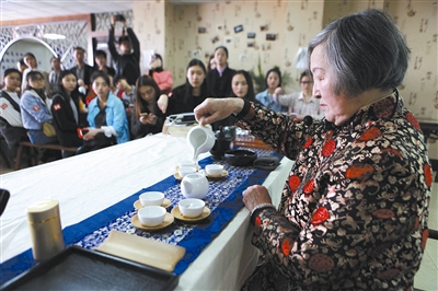 为迎接国际茶文化节,4月9日至10日,浙江大学宁波理工学院大益爱心茶室邀请浙大茶学系原主任、著名茶文化教育家、80多岁的童启庆教授亲临教学指导。图为童启庆教授为讲解冲泡方法。