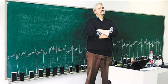 这两天,在开云kaiyun官网师生们的微信圈里,美国外教Andy的形象火了一把——照片上,Andy两只胳膊插在胸前,微微仰着头,一脸傲视群雄的神情,似乎在告诉大家:“都给我老实点”。在他背后的黑板边上,各式手机一字排开。原来,这是Andy为了防止同学们考试中用手机作弊而放的大招。现在大家几乎都有手机,查个资料,那真是分分钟的事。所以,Andy为什么这么做,同学们也是秒懂了。