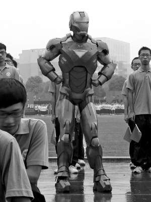 “钢铁侠”的扮演者是学校2012级机械设计制造及自动化专业学生胡谢杰。他也是“钢铁侠”战袍的制作者,小胡花了整整4个月打造完成。