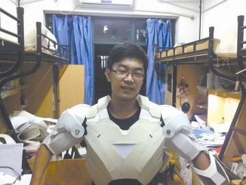 本报讯 (记者 江天宇 通讯员 黄蓓蓉)激光手套、喷气背包……看过美国大片《钢铁侠》的观众,都会对影片中男主角身上那套价值不菲的装备羡慕不已。浙江大学宁波理工学院一名大学生突发奇想,竟花几年时间,打造出了一副“钢筋铁骨”。昨天,他把这套装备带到寝室,让室友们一睹风采。