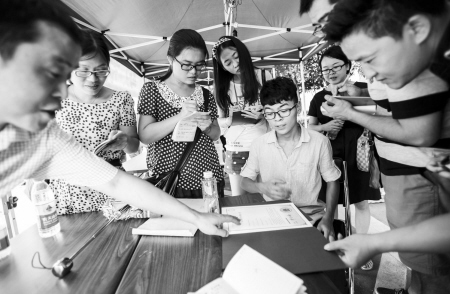唐旺(正中坐着的男孩)昨天成了浙江大学宁波理工学院报到现场的焦点。 徐佳伟 摄