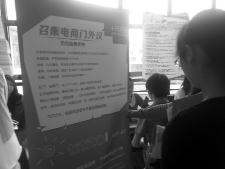 “召集电商门外汉”、“无经验者优先”。高新区一家经营母婴品牌的电子商务公司招聘海报上标出了这样的优先条件,吸引了众多大学生应聘。公司人事专员王小姐解释说,实习生一来没有工作经验,二来工作时间差不多只有一个暑期,到公司主要是熟悉社会和公司,“无经验者优先”恰恰最符合实习生求职需求。