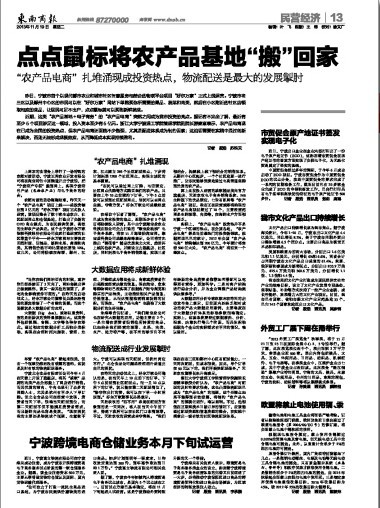 近期,这类“农产品(000061,股吧)基地+电子商务”的“农产品电商”突然之间成为我市投资的亮点。据记者不完全了解,最近有至少5个项目涉足这一领域,投入资本至少有5亿元。浙江大学宁波理工学院管理学院副院长游建章表示,农产品电商现在已成为全国的投资热点,但农产品电商还面临不少瓶颈,尤其是配送体系成为制约因素;这迫切需要在实践中通过创新来解决,否则无法形成规模效应,从而降低成本实现持续盈利。