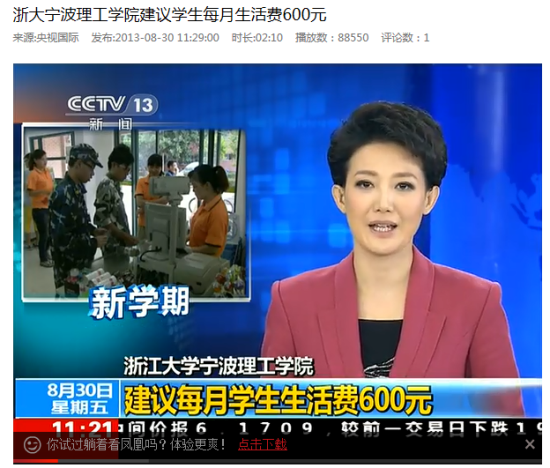 央视新闻:浙江大学宁波理工学院建议每月学生生活费600元