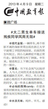 中国教育报:大二男生单车接送残疾同学风雨无阻