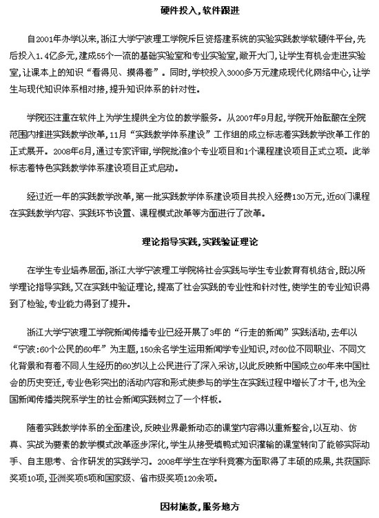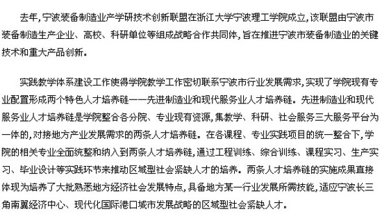 “实践教学体系建设工作使得学院教学工作密切联系宁波市行业发展需求,实现了学院现有专业配置形成两个特色人才培养链——先进制造业和现代服务业人才培养链。”报道说,浙江大学宁波理工学院整合各分院、专业现有资源,集教学、科研、社会服务三大服务平台为一体,对接地方产业发展需求的两条人才培养链。在社会服务平台上,有学生暑期社会实践;在教学平台上,一直坚持实践创新型人才的培养理念。
