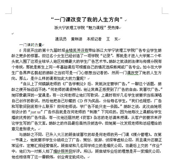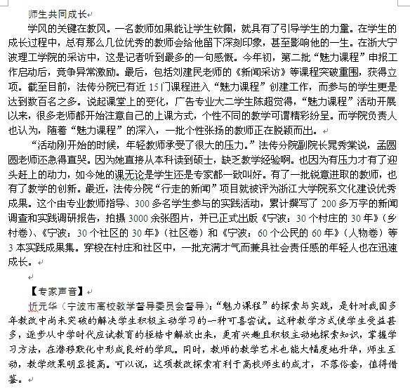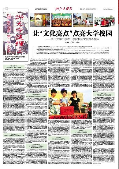 4月2日出版的《浙江大学报》,以整版篇幅刊发的《让“文化亮点”点亮大学校园——浙江大学宁波理工学院校园文化建设撷英》一文则对我院的校园文化亮点进行了全面梳理,报道认为:“近9年的发展,宁波理工学院朝气蓬勃的校园里,广大师生沐浴浙江大学百年求是精神的同时,也感受着宁波理工学院在自身发展过程中形成的浓厚的校园文化气息。”