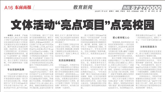 学生的全面发展,离不开校园文化建设。7月10日,《东南商报》以《文体活动“亮点项目”点亮校园》深度报道,专题介绍了浙大宁波理工的校园文化建设。从“行走的新闻”到“党员挂牌”,报道中呈现了理工丰富的校园文化活动。媒体关注学院坚持建设内涵丰富的校园文化,充实学生的文化生活,不仅在课堂上提升学生的学习能力,在课余生活中,注重学生活动能力的培养,提升学生的文化涵养。